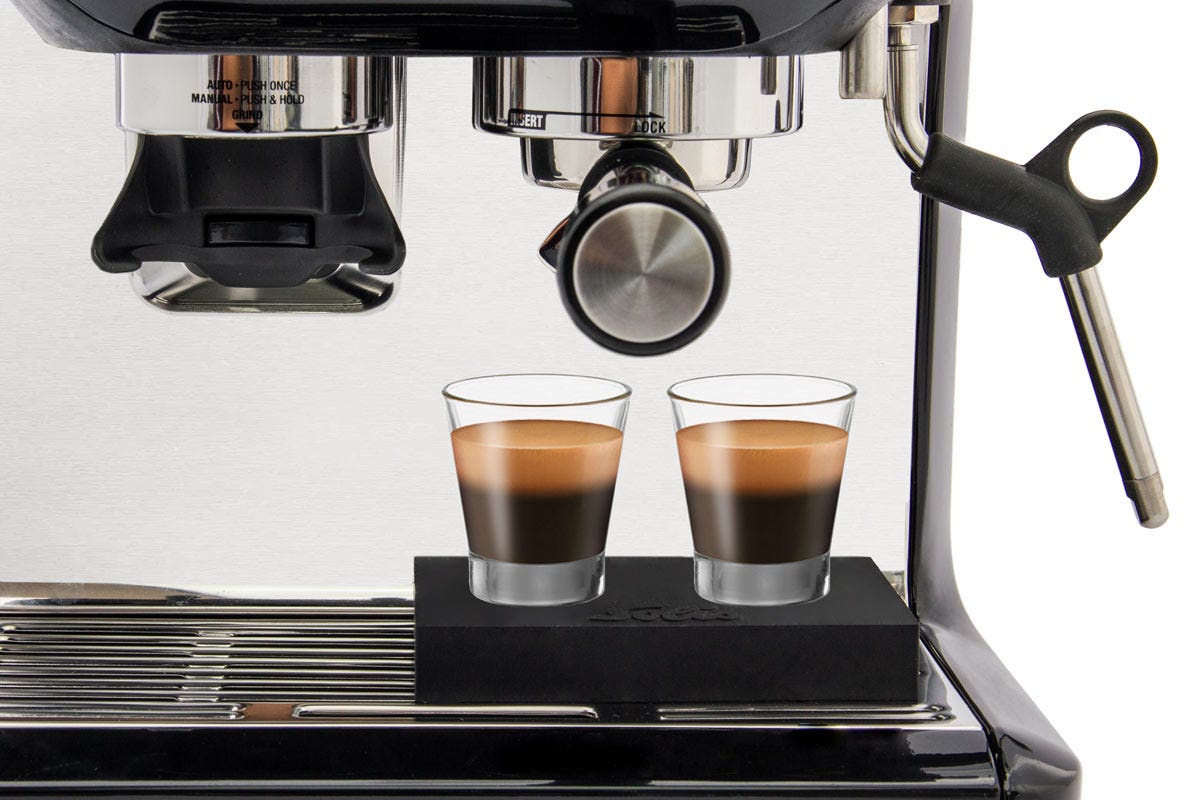 Les petites tasses sont soulevées plus près du bec du porte-filtre pour un versement sans éclaboussures.